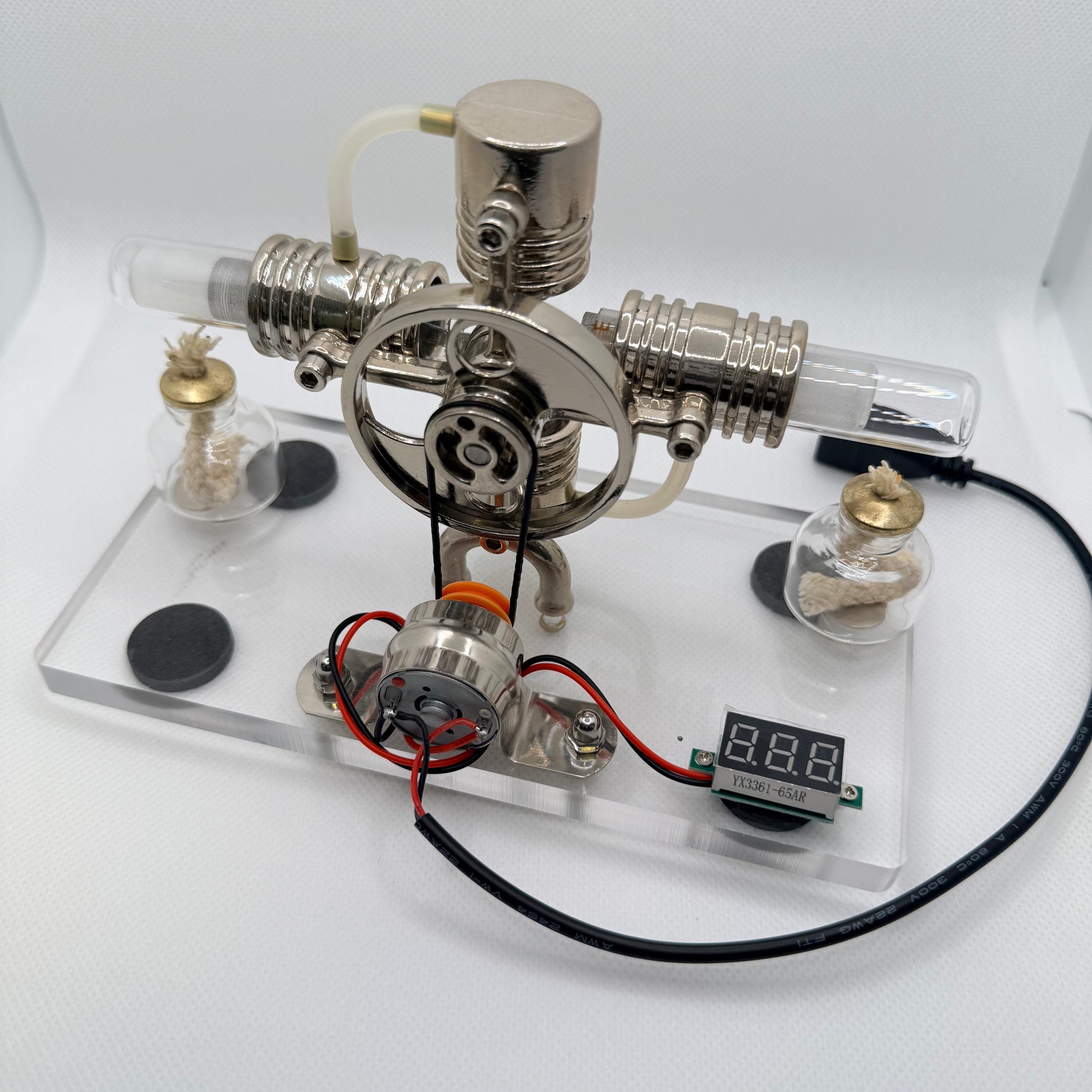Unleash the beauty of mechanical motion and power generation with the Cross Twin Stirling Engine Generator Kit. This fully functional model uses external heat to drive dual pistons and light up an LED voltmeter—delivering a captivating display of science in action. Designed for hobbyists, students, engineers, and collectors, it's the perfect blend of educational tool and kinetic art.